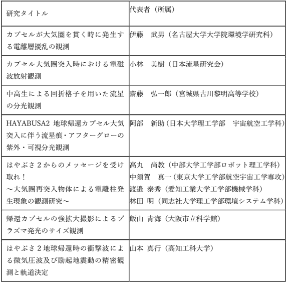 2020年12月6日に「はやぶさ2」のサンプルリターンカプセルが地球に戻ってくるときに、観測の公募を行いました。 採択された観測研究テーマを下の表に示します(リンクはこちら)。 実際には、新型コロナウイルス(COVID-19)により、オーストラリアへの入国が制限されたため、公募観測に採択された方は オーストラリアに入国できませんでしたので、可能な範囲でプロジェクトメンバーが代理観測を行いました。 観測の成果について記事を書いていただきましたので掲載いたします。